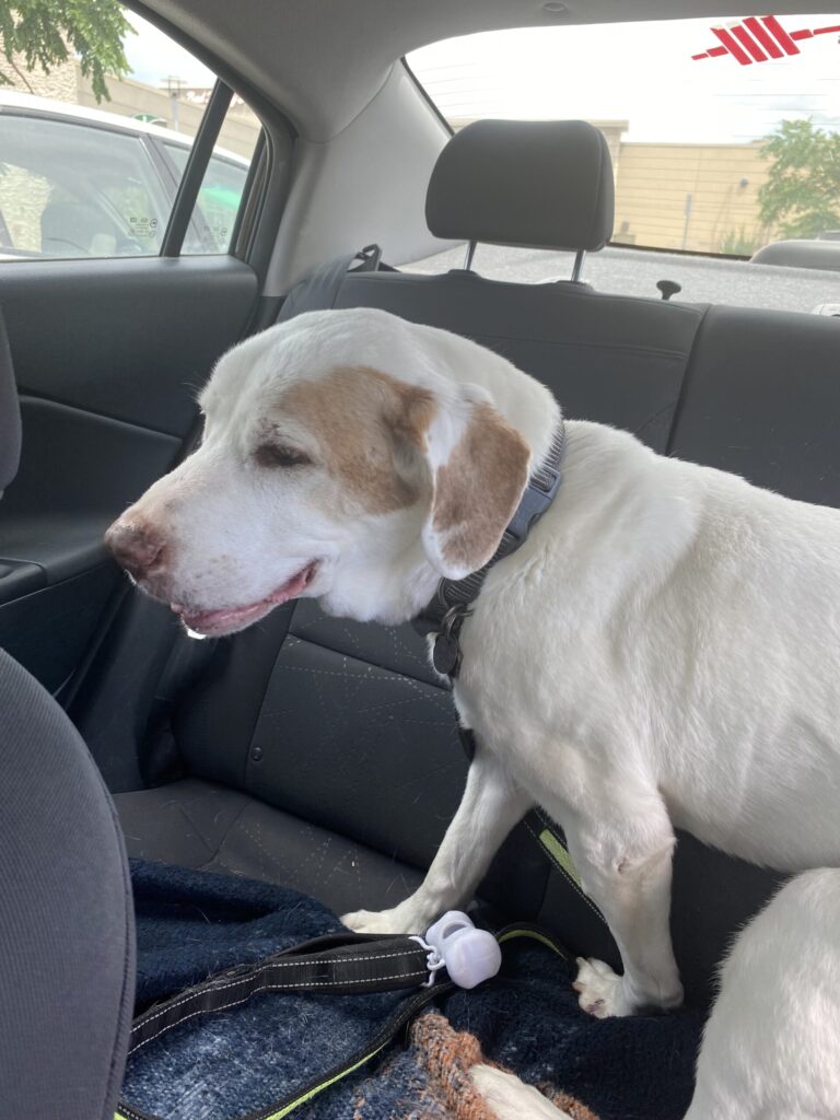The car in front of me must think it’s hilarious to drive at the lowest speed possible. I whip around them and turn right into the parking lot. I hold back a slew of curse words. I’m grumpy, but I don’t know why. I pull up to a parking space at the animal hospital. Watson squeals in the back seat. He gets anxious during car rides. An elderly hound dog with a brown spot on his eye, he has a vet appointment to help him with his arthritis. His whines fill the car. Upset thoughts fill my head.