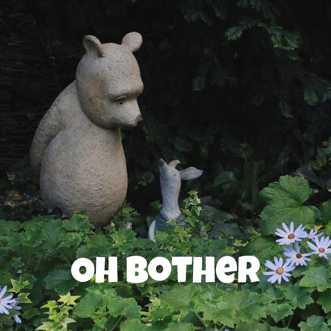 He sent me one back of Pooh bear blowing a butterfly from his nose. “No bother,” he said. When he got bothered that week, he thought of Winnie the Pooh. He lightened his heart by letting go. My client felt his way into this new life. He didn’t force it. He asked himself if it was possible to not be bothered right now.
